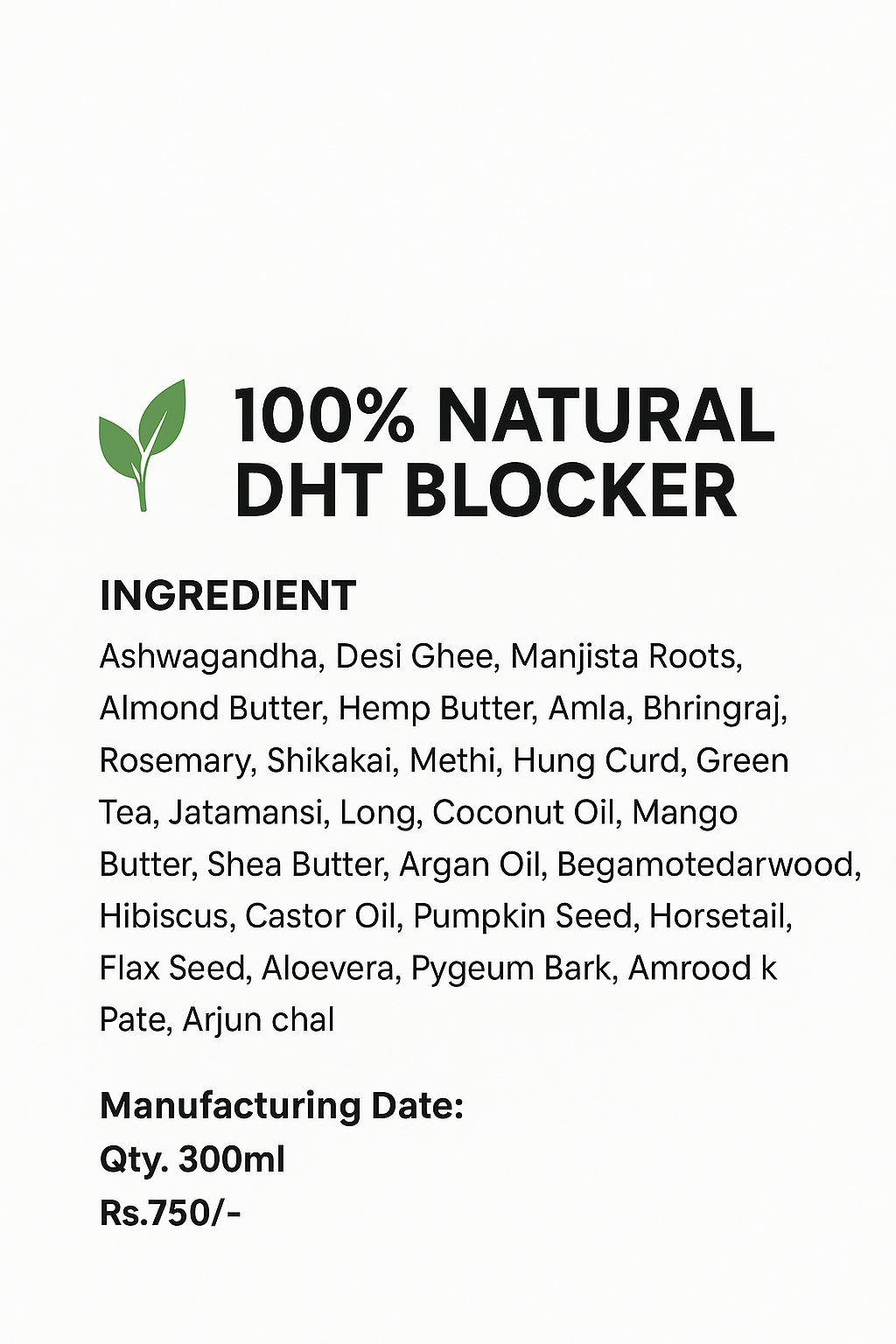 Ingredients-Ashwagandha,Amrood leaves,Moringa, Desi Ghee ,Manjista,Hemp butter, Amla,Bhringraj ,Rosemary ,Methi ,Almond butter, shea butter,Pygeum bark, Aloevera ,Flax seeds,Sunflower seeds ,Horsetail,Pumpkin seeds,Hibiscus,Begamotcedarwood ,Argan oil ,Mango butter ,coconut oil ,Cloves,Argan oil ,Hung curd ,Jatamansi,Shikakai,Castor oil ,Arjun chal
